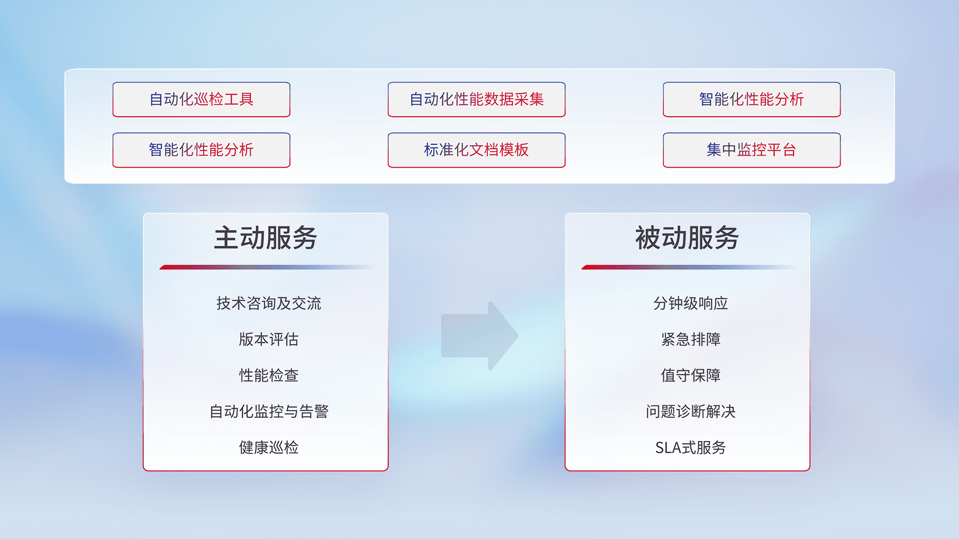 智能化工具和标准化文档,,保障服务质量,,,,提供主动服务(包含技术咨询、、、、版本评估、、性能检查、、、自动化监控与告警、、、、健康巡检)和被动服务包含(分钟级响应、、、、紧急排障、、值守保障、、、问题诊断解决、、SLA服务)。。